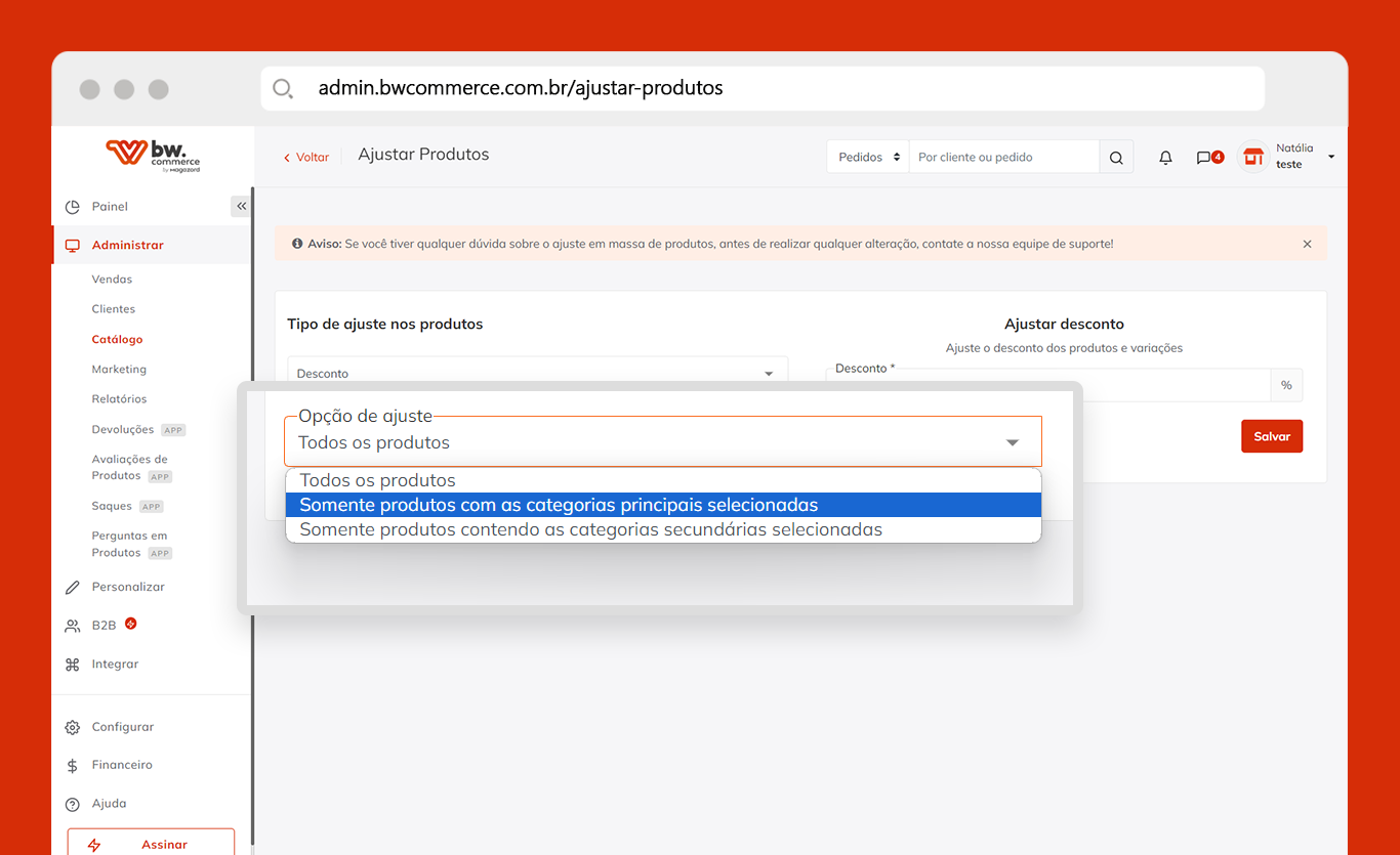 Em Catálogo > Ajustar produtos, através de um novo campo de configuração, é possível ajustar descontos, dimensões e peso em massa somente para produtos com as categorias principais selecionadas ou somente produtos contendo as categorias secundárias selecionadas. É só marcar os checkbox juntamente com outros campos preenchidos e salvar a configuração.