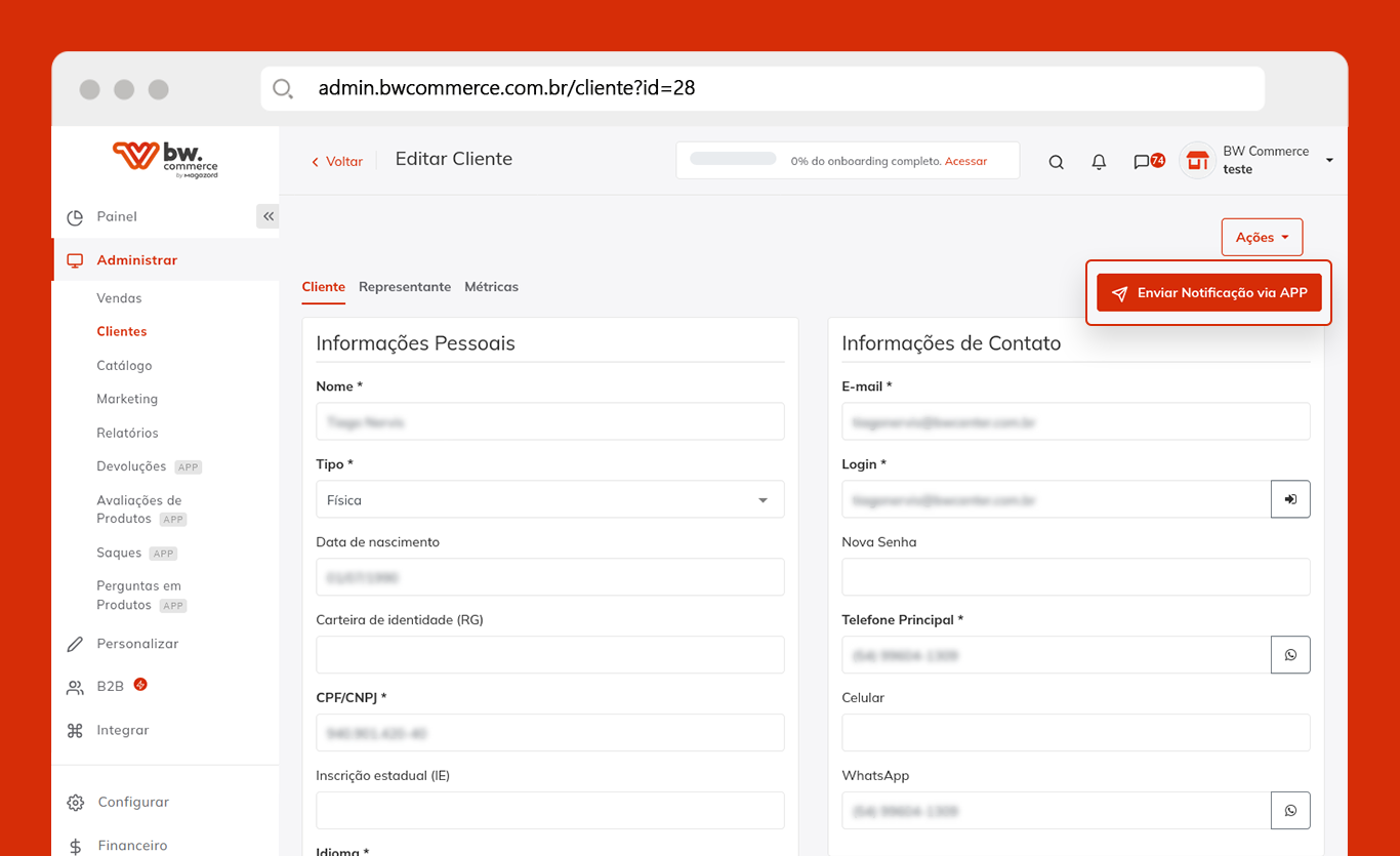 Se sua marca possui nosso aplicativo de vendas, agora você pode encaminhar notificações personalizadas para cada cliente. Para enviar é muito simples, basta acessar Administrar > Clientes, selecionar o cliente desejado e na aba métricas, clicar no botão “Enviar Notificação via APP”. Escreva a mensagem, clique em enviar e pronto! Notificação configurada!