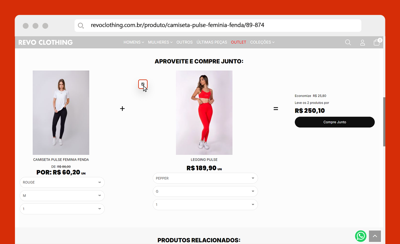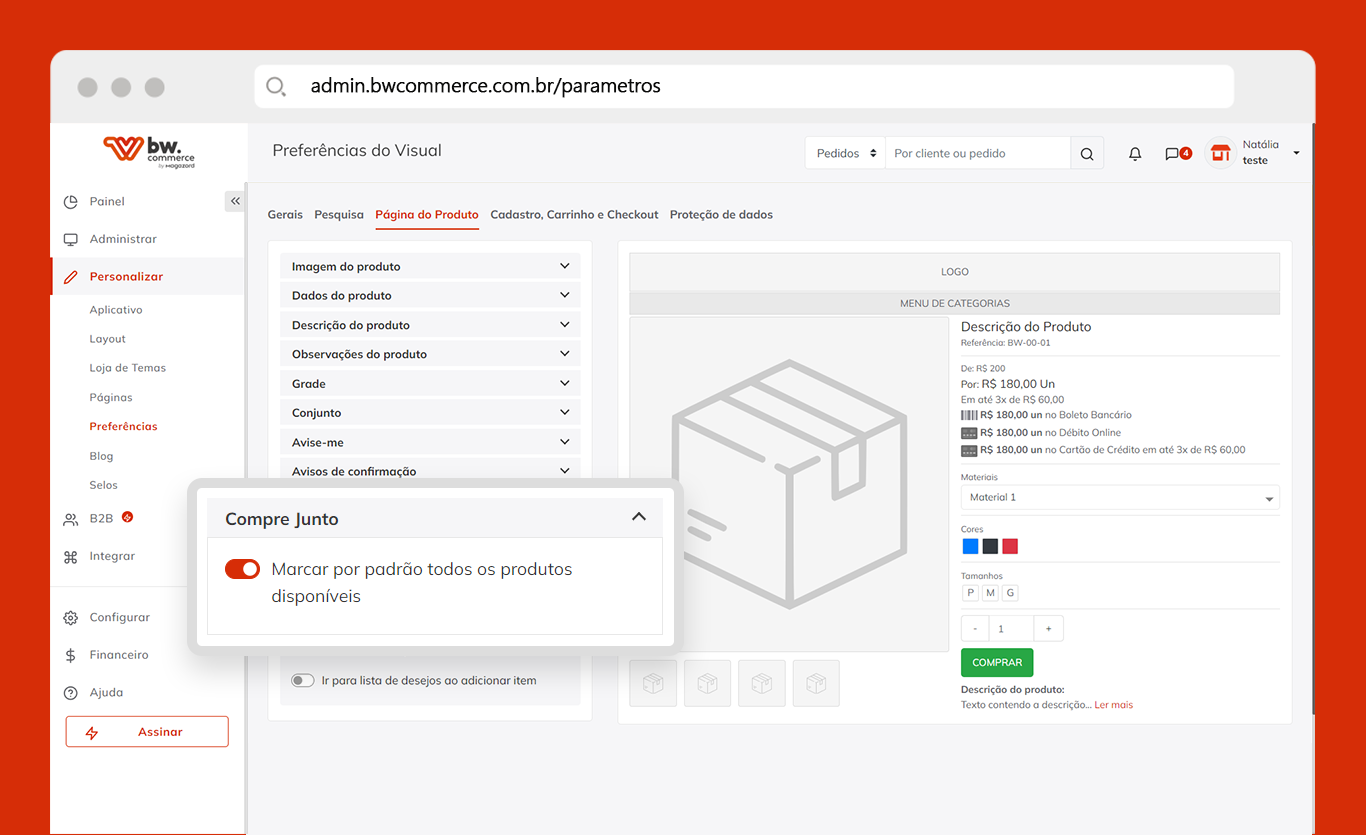Através do novo parâmetro, é possível deixar os itens da seção Compre Junto já pré-selecionados, facilitando o processo de compra do usuário caso ele opte por comprar os produtos complementares. Para habilitá-lo, acesse Personalizar > Preferências, na opção Página do Produto vá até Compre Junto e ative “Marcar por padrão todos os produtos disponíveis”.