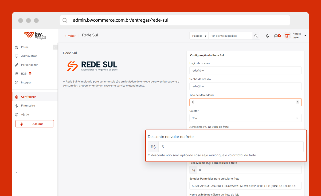 Campo de desconto no valor do frete 🚚