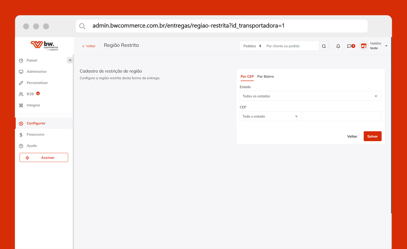 Publicamos uma nova melhoria em Configurar > Formas de Entrega > Entrega Personalizada. Para restringir regiões para entregas personalizadas, basta clicar em editar e adicionar as regiões desejadas, por CEP ou por Bairro.
