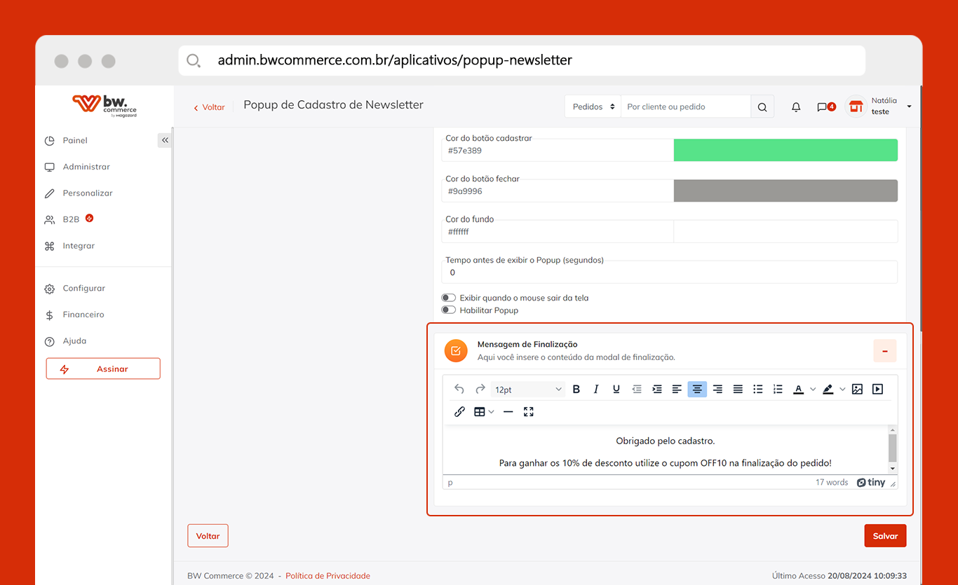 Personalização da mensagem de finalização no Popup da Newsletter 📨